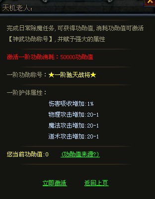 神武功勋成就分为很多阶。阶级越高所加成的属性也就越强大,升级称号需要功勋值!功勋值有两个获得途径。