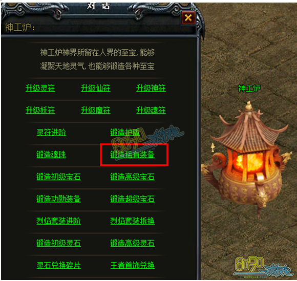 传送到沙漠土城找到神工炉,与之对话可以找到锻造稀有装备的选项,也就是锻造灵石的地方,比之前增加了时装的锻造,帝剑和烈焰时装都可以在这里锻造,其中神兵荣耀需要三件帝剑才可以合成,而且需要4个烈焰锻造石,所以光有帝剑是不够的。