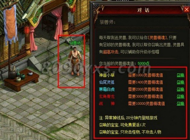下面讲讲如何召唤灵兽:在烈焰中所捡到的每一样东西都有其价值,当而你筹集足够的灵兽精魄,就可以在NPC驯兽师处召唤灵兽。最快捷的获取方式就是使用灵兽精魄,可以在商城的特有商品购买获得。而烈焰灵兽系统中护送不同等级的灵兽,也可以获取精魄。