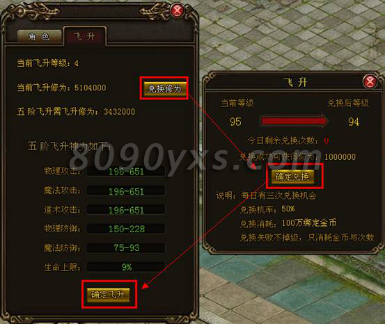 3、对应的等级有对应的飞升修为,点击“确定兑换”后,将扣减角色等级而获得对应的修为;