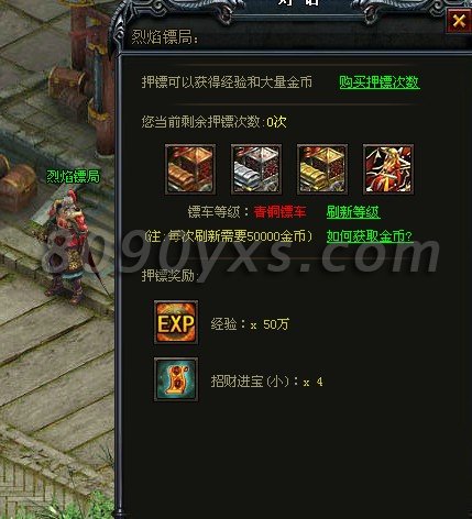 不可否认,8090烈焰护送押镖是日常活动中获得金币最多的一个。每天免费地接两次,运气好的话,一天600万不成问题。因为镖车是分品质的,一个四个品质等级,等级越高,其奖励也越高,最高品质的美女镖车一次可获得300万金币和300万经验的奖励,当真是财色赚收。