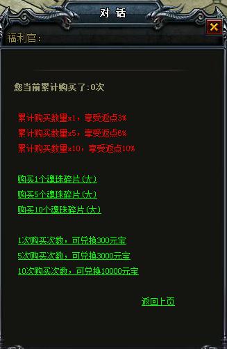 活动说明:只要在烈焰城[福利官]处购买[魂珠碎片],即可领取元宝返利,多买多返,不限购买次数,详情查看游戏内活动NPC。