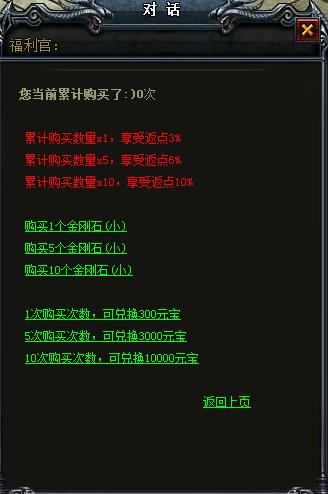 活动说明:只要在烈焰城[福利官]处购买[金刚石],即可领取元宝返利,多买多返,不限购买次数,详情查看游戏内活动NPC。
