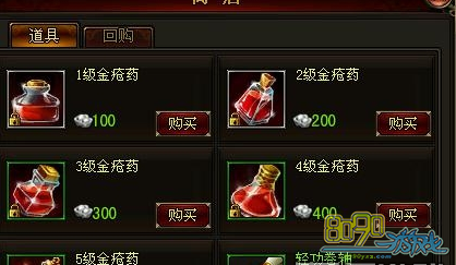 首先就是金疮药和轻功卷轴,金疮药是我们在游戏中最重要的消耗道具,我们很多的银子都花在了金疮药上,因为我们挂机不可能没有消耗金。疮药共分为五个等级,不同等级的金疮药恢复的效果是不同的,而这些药品使用的等级也是不同的,大家切记不要在低等级的时候买高级金疮药,浪费钱不说还耽误事。 轻功卷轴是游戏中能够快速到达某一个位置的重点道具,在游戏中使用非常频繁,但是大家购买这个道具的时候需要注意一个非常重要的问题,那就是如果您是VIP玩家,那么就不要购买这样的道具,因为在游戏中这样的道具VIP使用是不消耗,直接就有传送功能的,白花钱。