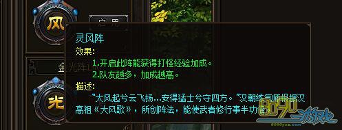 灵风阵开启后能获得打怪经验的加成,队友越多,加成也就越多哦,大风起兮云飞扬,安得猛士兮守四方,汉朝练气师根据汉高祖大风歌,所创阵法,能使武者修行事功倍呢。大家可通过做主线任务获得哦。