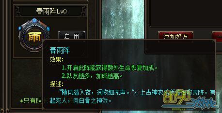 随风潜入夜,润物细无场 ,上古神农氏所传治愈灵阵,有起死人,肉白骨之神效。开启此阵能获得额外生命恢复加成,队友越多,加成也就越高哦。