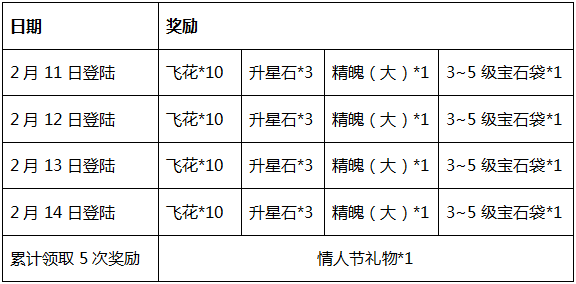 【活动说明】:活动期间,玩家每日登陆游戏,可获得1份情人节奖励。首充和黄金王权可额外领取1次