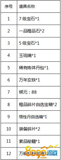 使用后,可获得以下道具:保底符*5、3~5级宝石袋*1、稀有炼体丹*2、普通炼体丹*5、10万铜钱卡*5
