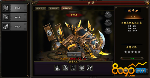 搜索"8090网页游戏"在乐游三国游戏中,骑乘一只与众不同的坐骑在游戏中飞奔,不仅拉分,而且也会让战力飞速飙升。游戏开始会赠送一只初始坐骑,玩家可通过主界面下方的坐骑图标进入坐骑界面。