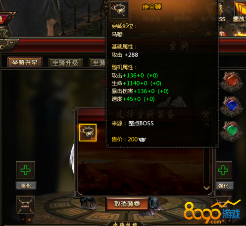 坐骑拥有专属的装备,玩家可通过参与整点boss获得坐骑装备和强化石。坐骑每个部位装备会有相应的属性加成。