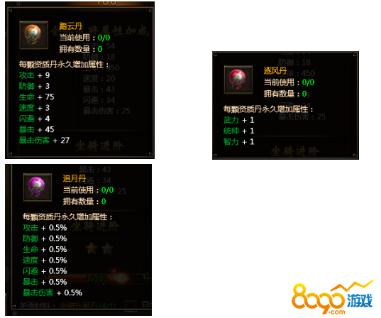 坐骑可以吞食资质丹,每吞食一颗,都可获得该资质丹加成的属性。