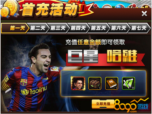 活动内容:首次充值任意金额即可领取超级巨星红色哈维和大量饭票兑换券、训练手册和技能秘籍,七天首充皆可领取不同的超值大礼包,就是这么壕。