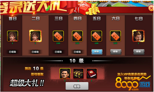 活动内容:登陆有惊喜,豪礼来相送!活动期间,登陆游戏后即可在登陆有礼活动界面免费领取登陆豪礼,七天登陆豪礼连领七天,托雷斯,小贝和饭卡等你拿。
