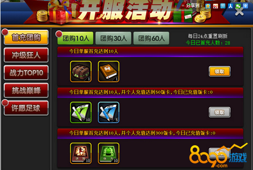 活动内容:活动时间内,单服每日充值人数达到指定条件,全服玩家即可免费领取一个礼包;有充值的玩家可再额外领取一个礼包;自身当日充值达到指定饭卡,可再次领取一个礼包。