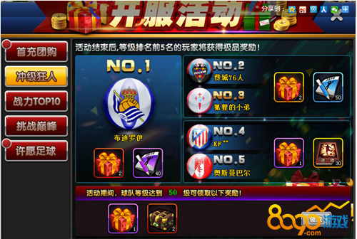 活动内容:活动时间结束后,单服等级排名前5名的玩家将获得极品奖励!高级球员礼包、技能秘籍还有爆星指引等你来拿,活动期间球队等级达到50级还可领更多奖励。