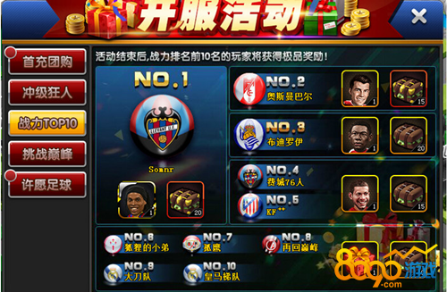 活动内容:活动时间结束后,单服战力排名前10名的玩家将获得极品奖励!罗纳尔迪尼奥、贝尔、阿拉巴、阿尔巴等超级巨星直接加入你的豪华阵容,还有海量饭票免费送!