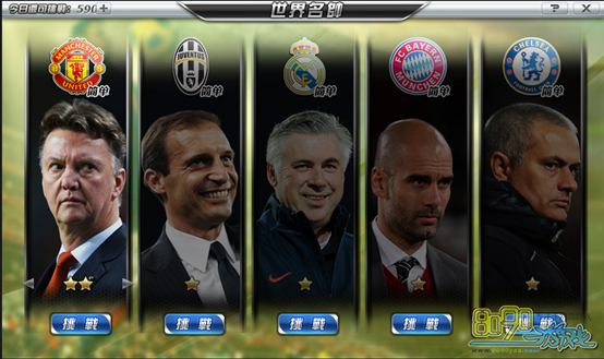共有5位名帅等待你的挑战,战胜他们会获得对应的教练碎片和战术书