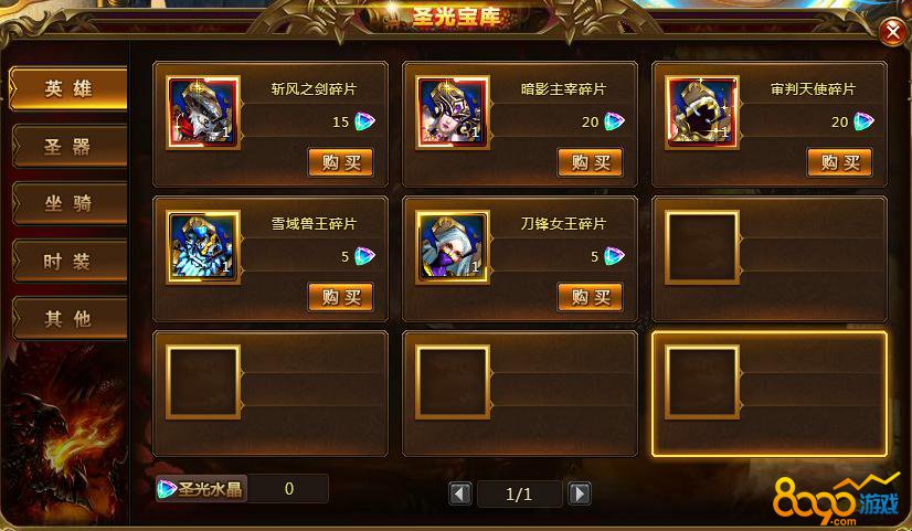 龙之领主里,玩家可以通过点击界面右上角的圣光宝库图标进入圣光宝库。圣光宝库中的物品可以用圣光水晶兑换。宝库中玩家可以兑换的有五大类。分别是:英雄、圣器、坐骑、时装、其他。