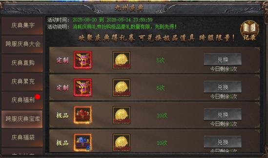 1、「庆典宝库」消耗庆典券,全服兑换指定道具,全服限量;