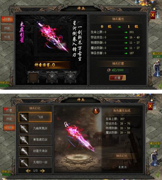 神兵可以同时佩戴3把,并且提供幻化支持外观更变。