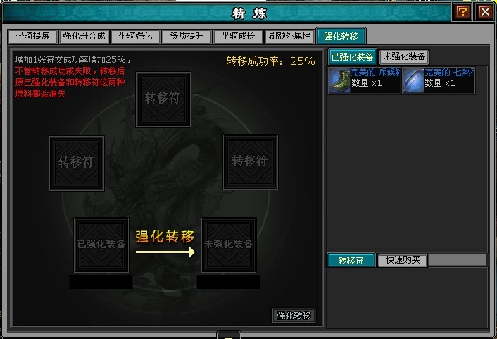 在里面放入强化好的装备一件,和一件需要强化的装备,放进之后,千万别急着点强化转移哦,不然到时转移后的强化属性并没有您想像中的那么好呢.如果你直接点下去,转移成功率只有25%的机率哦,所以,你有可能获得一个不咋的强化属性,到时你只能抓狂了.