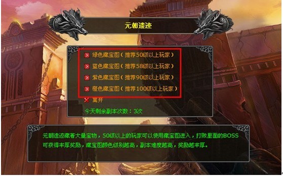 等级达到50级以后并且拥有藏宝图就可以参加元朝遗迹副本了。玩家可以在漠北找到“元朝遗迹”点击进入。每个玩家一天只能进去3次,每次时间限制为10分钟。所以请抓紧时间哦,奖励多多,机会不容错过。