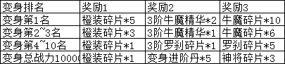 活动说明:开服第7天变身总战力达到10000可领取奖励,条件达成后请尽快领取,跨天后将清除,活动结束时根据排行榜名次可领取奖励