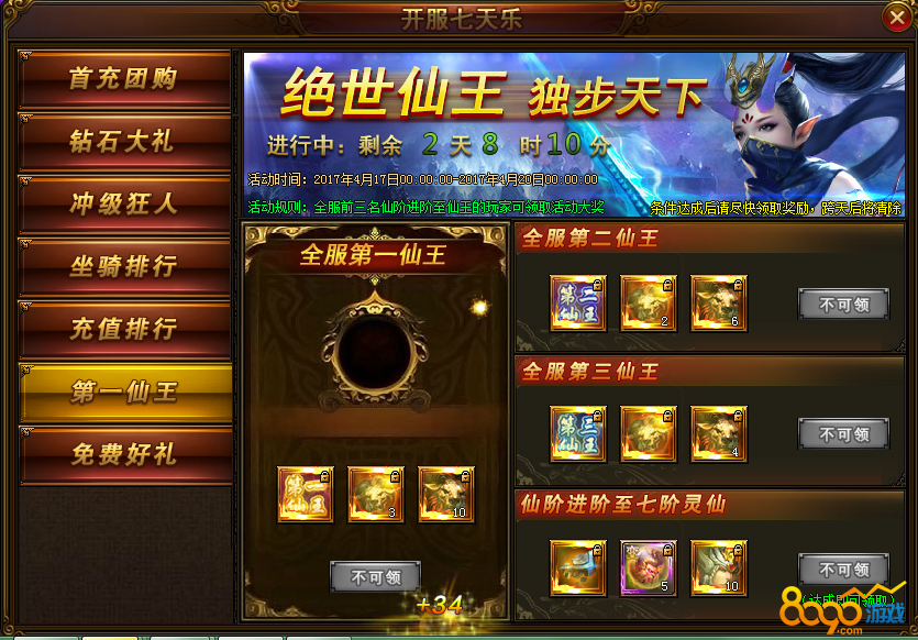活动说明:开服前3天仙阶达到7阶灵仙可领取奖励,活动结束时根据排行榜名次可领取奖励,条件达成后请尽快领取,跨天后将清除