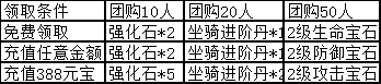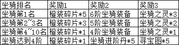 活动说明:开服前天坐骑达到4阶可领取奖励,条件达成后请尽快领取,跨天后将清除活动结束时根据排行榜名次可领取奖励,
