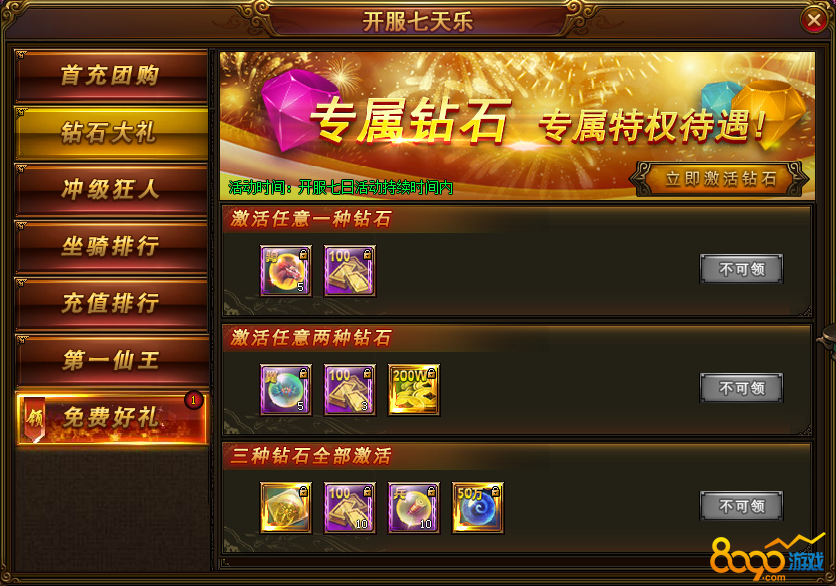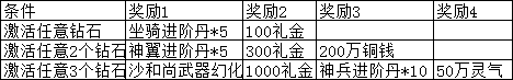活动内容:活动期间玩家只要激活相应数量钻石即可获得额外奖励!钻石可以带来极大战力及特权加成,还有炫酷特效!至尊王者象征,你绝对不能错过!