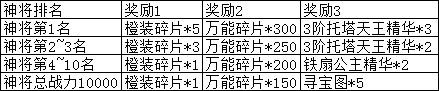 活动说明:开服第4天神将总站力达到10000可领取奖励,条件达成后请尽快领取,跨天后将清除,活动结束时根据排行榜名次可领取奖励