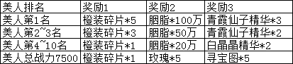 活动说明:开服第6天美人总战力达到7500可领取奖励,条件达成后请尽快领取,跨天后将清除,活动结束时根据排行榜名次可领取奖励