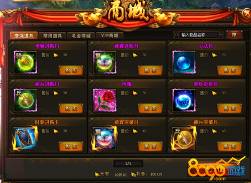 通过8090《萌宠西游》游戏主界面底部的【商城】图标,先进入商城界面,商城界面共有四个页签:变强道具,常用道具,礼金商城,VIP商城。