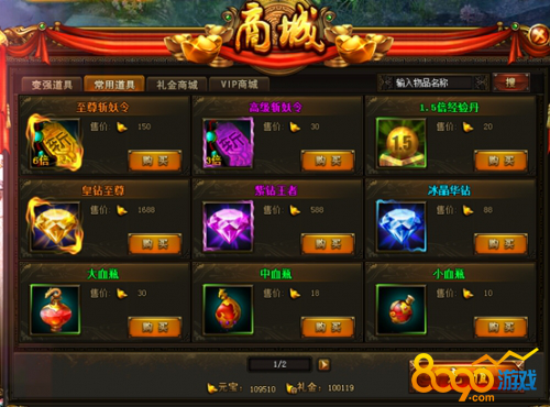 常用道具页签中提供了各类常用道具的出售,比如经验丹,血瓶。