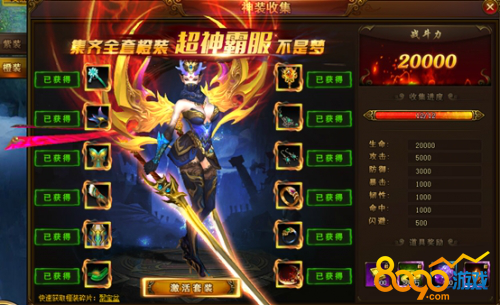 主界面为紫装收集,收集每个等级的每个部位的紫装可激活套装属性以及获得道具奖励。