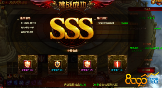 采用全新黑科技可自动匹配队伍进行 挑战。通关后有几率掉落绑金、普通打磨石、精致打磨石和神器升阶石,在第一重第二关已经出现了哦,天界中就不会显示挑战BOSS的名字,只显示它的战斗力。在此之外每一关卡通关之后,不仅能得到掉落的奖励,还能令玩家在此之后的战斗中针对属性有所提升,上面的防御提升(大)、防御提升(小)、攻击提升(小),这边小编推荐大家选择大的呢,因为在挑战中不仅要注重战斗力,提升防御也是很很重要的。第一重天的第3关,挑战115W生命值的怪物。在这里小编要特意说下在每一关过后,会有两次补给的机会们不能浪费一定要强化自己的攻击、防御以及暴击、命中等属性,这样才能更加有把握的去挑战。