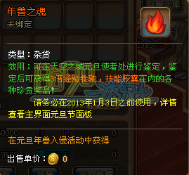 【年兽之魂】:可在天空之城NPC【元旦使者】处进行鉴定,鉴定后可获得3倍经验卷轴、技能胶囊在内的各种珍贵奖励