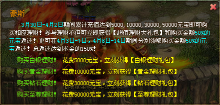 【内容】活动期间累计充值达到5000,10000,30000,50000元宝的玩家可购买四种相应的理财,机会难得,千万不要错过哦!更多详情请前往【豪斯】处查看!