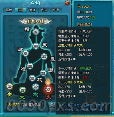 看到了吗,当元神的所有境界都提升到3层,5层,8层,12层……的时候是有额外的属性加成的。赶紧全面提升吧,战斗力的增加从这里开始。当然如果元神丹富裕,可以把你的主属性境界稍微提升高一点。但是重点是,不要再让你的五行境界是0了。