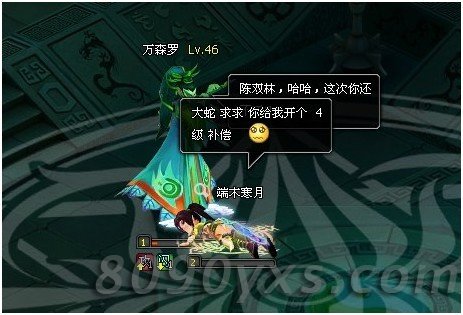 镇妖塔四层BOSS万森罗,难度比起上一层又加了许多,这个长得绿油油的怪人,貌似记得他开头会说一句,他最喜欢绿的东西,比如绿帽子 O(∩_∩)O哈哈~!本层建议开始先清小怪,BOSS第2回合会晕人,第3给自己加50%攻击,第4回合会用上抱元守一,减伤40%的攻击,第7回合释 放群体攻击技能,第10回合会释放一个很恶心的控制技能冰雷爆,附带全体眩晕的效果,之后又放一个群攻魔法,同样中招之后会持续掉血,第12回合BOSS 会狂暴,给自己加8000血跟50%攻击!本层推荐战力4800以上,等级50以上,原因嘛,因为50级就能使用天心丹回复3200的大药,所以你懂得。