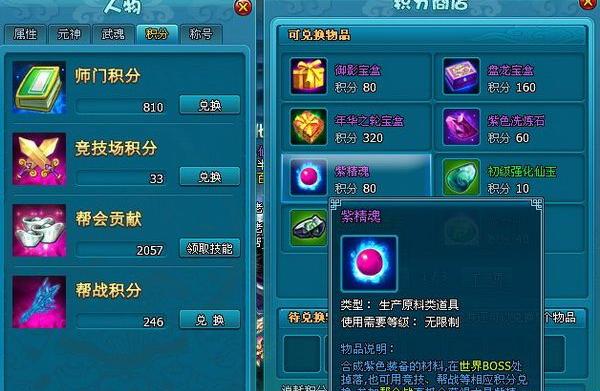 除了拼人品的抢BOSS外,经由三个活动也可以获取紫精魂。一是每晚七点的竞技场,参加后所获得的积分,能够用来兑换紫精魂、高品质指环等稀世珍品;二是每周一、三、五的帮战,宝盒有几率会开出紫精魂,同时帮战积分可以用来兑换紫精魂;三是每周二、四、六的答题活动,前三名的奖励中也包含紫精魂