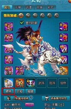 如图,在角色主界面坐骑栏下点击【喂养】即可进入坐骑喂养界面。