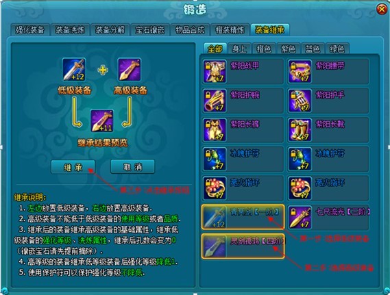 2.继承后的装备继承高级装备的基础属性,继承低级装备强化等级、洗炼属性,继承后孔数会变为0(镶嵌宝石请先提前摘除)
