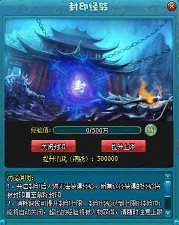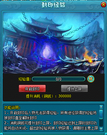 开启经验封印功能,人物将不再获得经验,所有途径获得的经验将被存储封印