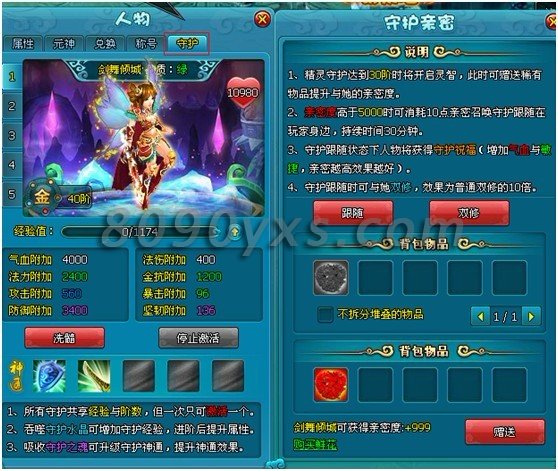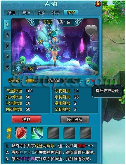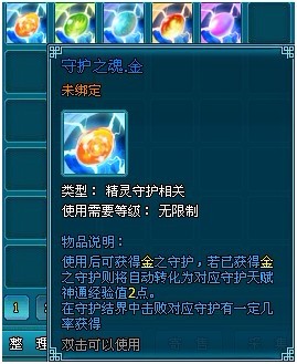 4、获得守护后可通过喂养守护水晶提高精灵守护的等阶,精灵守护激活后将直接增加人物属性,守护的等级越高,附加的属性越好。【守护水晶】直接在副本中产出。所有精灵守护共享经验和等级。