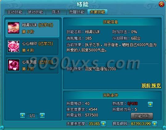 当获得夫妻技能后,攒够足够的亲密度与熟练度还可继续升级,提高技能效果。