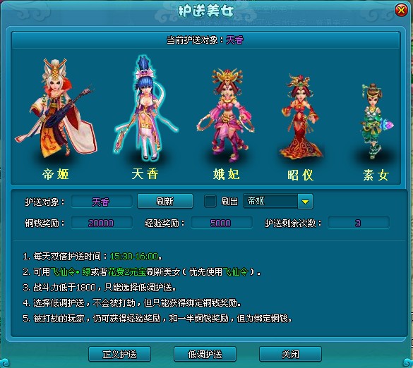 可以通过刷新护送对象,有几率护送奖励最高的“帝姬“哦!