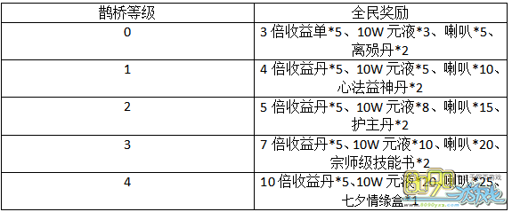 3、全服累积上缴到一定祝福值,可以增加鹊桥的长度。全服玩家可领取一次对应等级的奖励。
