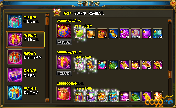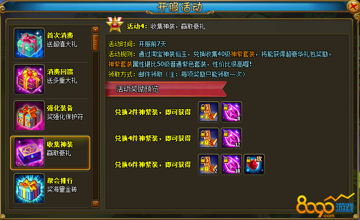 活动规则:通过淘宝神装仙玉,兑换收集40级神紫套装,将能获得超豪华礼包奖励。