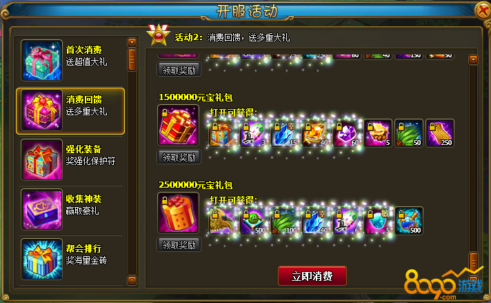 活动规则:活动期间,在商城/神秘商店/淘宝消费制定额度元宝,可获得我们送出的豪华礼包。内含挂饰、武饰、珍稀坐骑等极其珍贵道具!